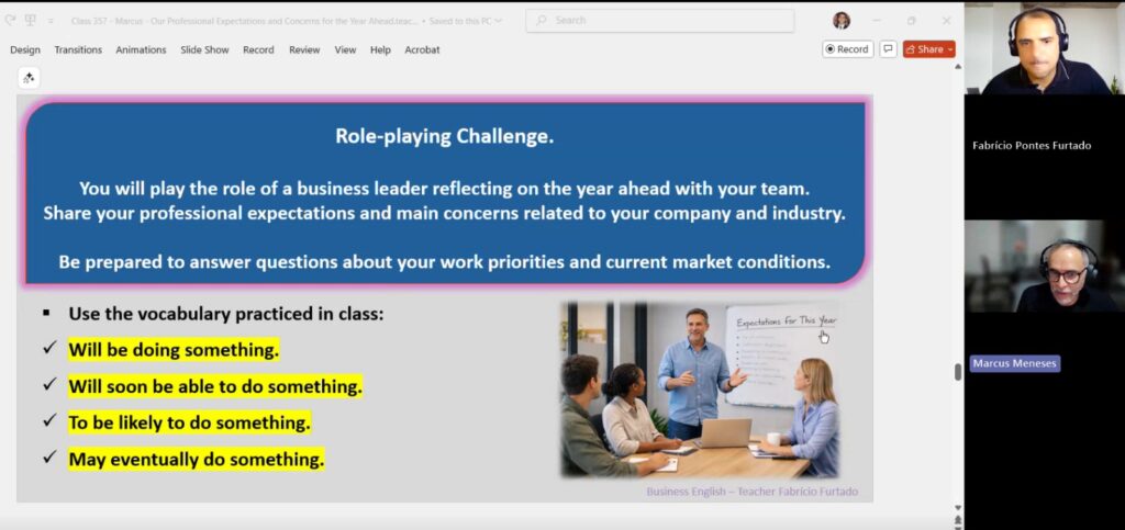 O professor acompanha o seu desempenho por meio de um ciclo contínuo de feedback. Você expande o vocabulário da sua área, aprimora a sua pronúncia e corrige estruturas gramaticais para comunicar-se com mais confiança, clareza e precisão.