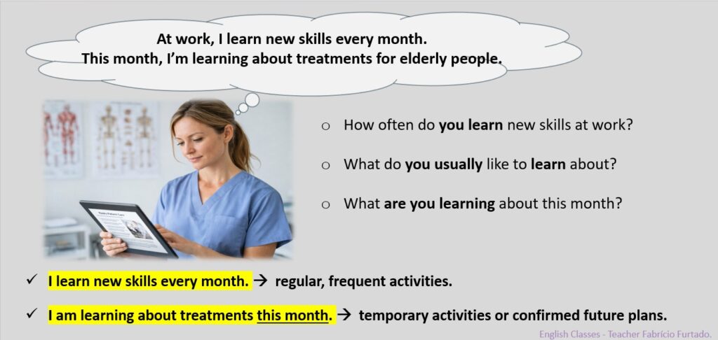 Hoje, ajudo adultos a usar o inglês com confiança no ambiente de trabalho, com aulas que vão muito além do convencional e conectam o aprendizado a situações reais, apoiando o aluno a atingir seus objetivos profissionais.